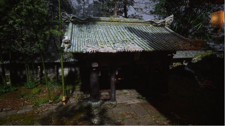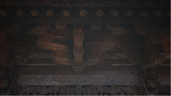 从游戏来看,山门与内门是同一模型,为歇山顶,五铺作斗拱。