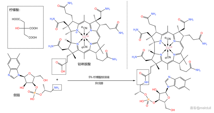 最后,我们需要把这条侧链“装”到钴啉胺酸上。为此,课题组测试了多种反应条件,最终选择使用柠檬酸铵溶液和异戊醇的混合物处理。二者顺利地发生脱水缩合反应,以 的产率得到最终产物: