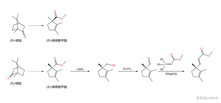 现在,我们先把产物放在一边备用,来处理第二个合成起始物。它被称作樟烯酸甲酯(,见下图),是樟脑经过一系列反应后得到的产物,很早之前就被人们合成。伍德沃德之所以选择它,主要是因为它拥有一个继承自樟脑的手性碳原子。