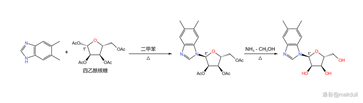 这样一来,碱基就搞定了。随后登场的是一种核糖的衍生物:四乙酰核糖——它直到今天都是核苷酸合成中的重要试剂。在二甲苯中,它与刚才制得的 二甲基苯并咪唑在